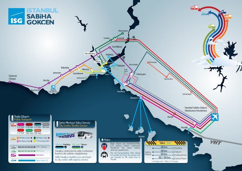 Por otro lado, desde el Aeropuerto Internacional de Sabiha Gökçen, en la parte asiática, tenemos dos líneas de autobuses que te dejarán en la estación Levent y desde ahí hacer un transbordo que te lleve al centro o el autobús de Havas que te deja en la plaza Taksim en una hora. Además, también tenemos opción de metro con combinación de ferry, autobús o tren para llegar a la zona europea. Y, como no, el taxi.