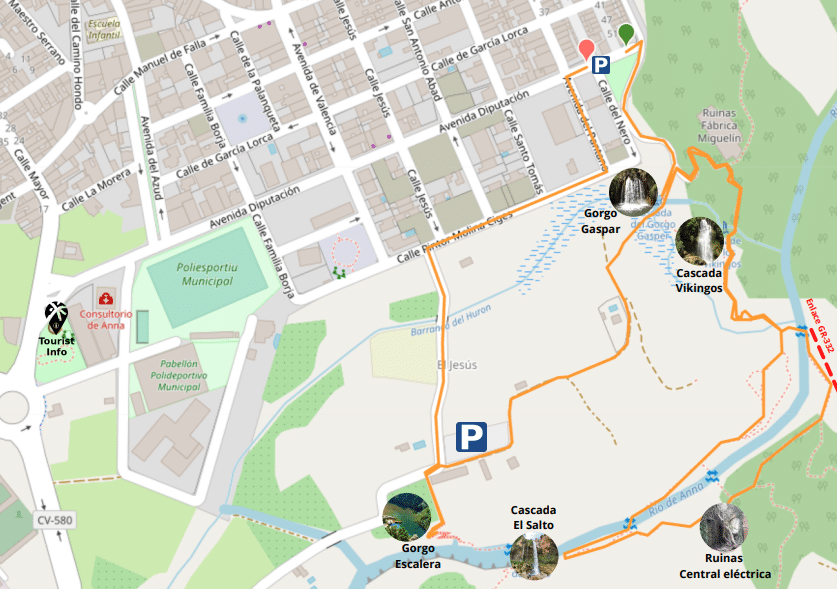 La ruta se inicia al final de la Avenida de la Diputación, descendiendo por el antiguo camino de acceso a la Fábrica Miguelín, donde nos encontramos con nuestra primera sorpresa, el Gorgo Gaspar, que cuenta con un pequeño mirador. Aquí se ubicaba antiguamente una noria que daba energía a una fábrica textil.